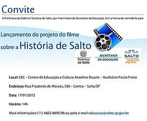 Com o objetivo de oferecer aos estudantes da rede municipal de ensino mais um instrumento de pesquisa e conhecimento sobre Salto, a prefeitura lançará o projeto de um filme sobre a história da cidade. O evento será destinado a toda a imprensa local e regional e acontecerá no dia 17 de janeiro (terça-feira), às 14 horas, no Centro de Educação e Cultura (CEC) Anselmo Duarte.